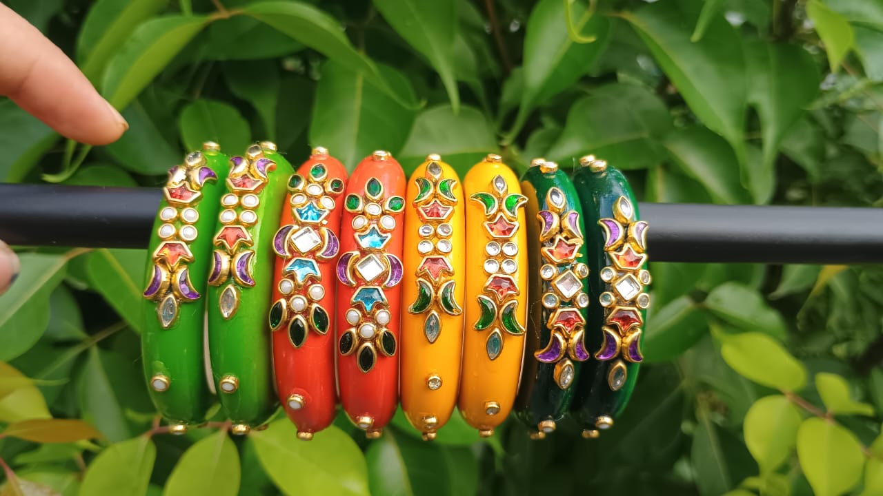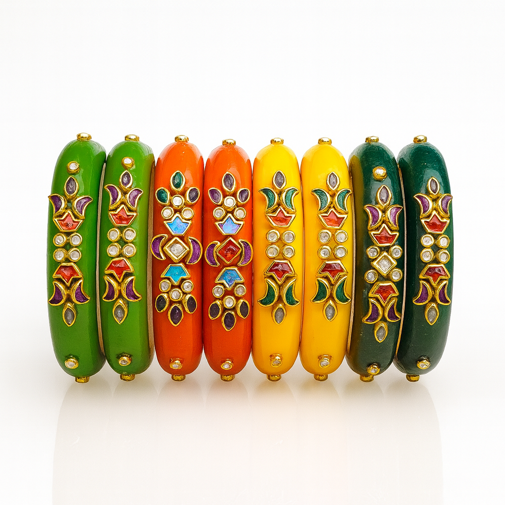 Turn every celebration into a statement moment with these premium enamel (lac) bangles. Each piece features a rich, high-gloss body and intricate kundan-style work—crescent and marquise motifs framed in a luxurious gold-tone setting, studded with glass polki and jewel-bright stones. The inner surface is smooth and comfortable for all-day wear, while the palette—parrot green, leaf green, vermilion, coral, saffron, marigold, emerald, and bottle green—lets you mix, match, and stack to suit your outfit.